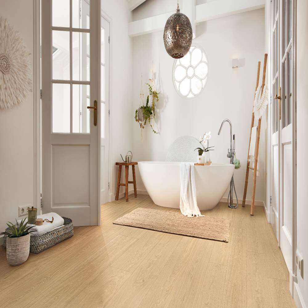 Por lo tanto, este suelo también puede colocarse en cuartos de baño. La superficie Diamond Pro resistente a los arañazos y el papel decorativo antiestático completan las ventajas técnicas de este suelo.