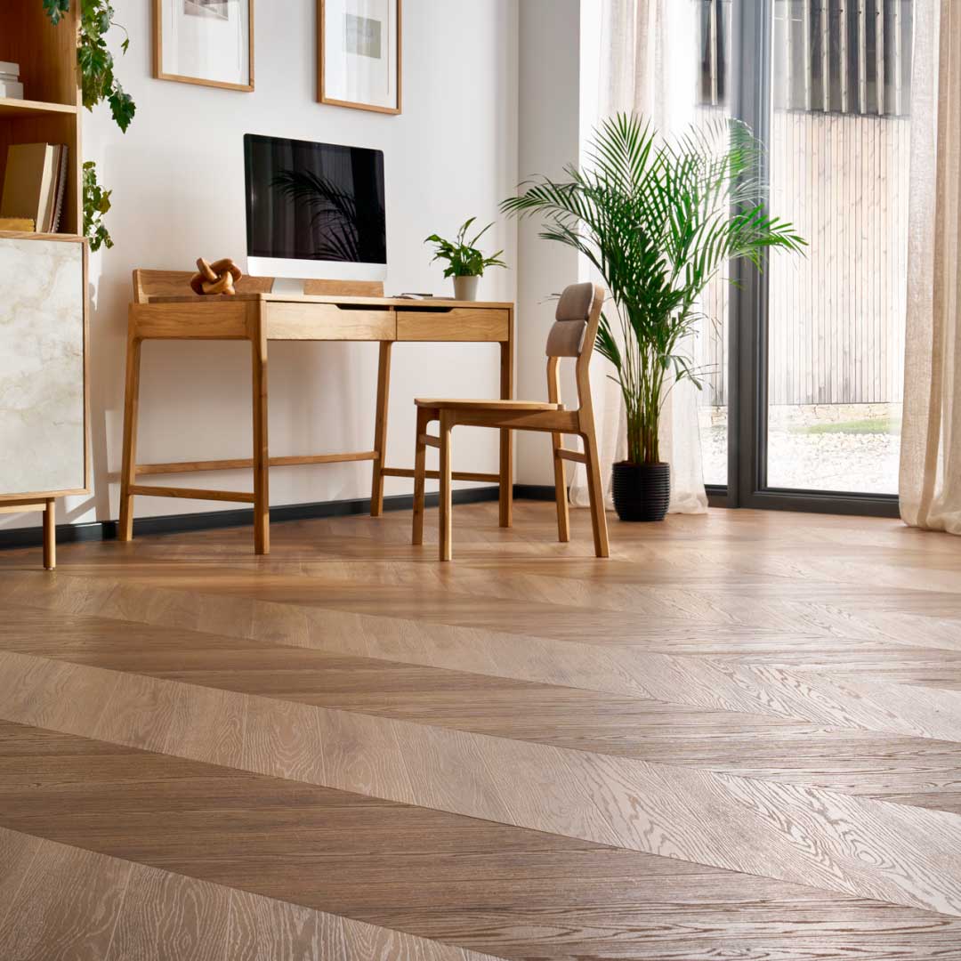 Suelo vinílico en click, instalación Chevron (espiga)